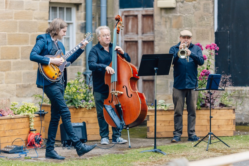Speaking of the drinks reception, we held it in the courtyard of the Abbey while a jazz trio (the groom’s brother plus two musicians they know from the local jam night) performed. We bought all prosecco and wine from Aldi which, even with the venue’s corkage included, meant a significant saving. It also meant we could guarantee all the drinks would be vegan.