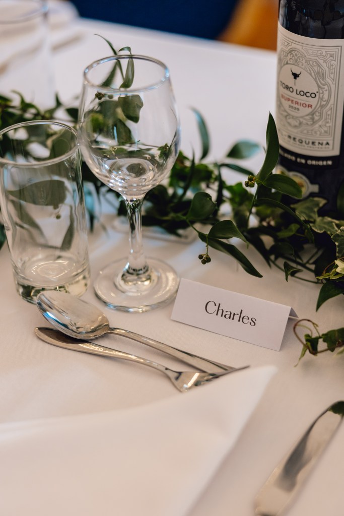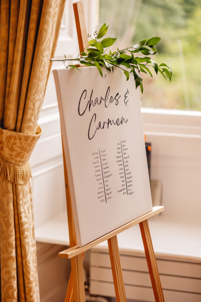 For the name cards (we toyed with the idea with not doing a seating plan at all but the lady in charge of weddings at the Abbey warned us that, in her experience, this had paved the way for chaos), I made them on Canva and it’s as easy as it looks. For the seating chart, I arranged the names in a way I liked in Canva and then printed it out. I then sellotaped it to the back of a canvas, shone my phone torch through and traced everything onto the canvas with a calligraphy pen my Maid of Honour got me from her honeymoon!
